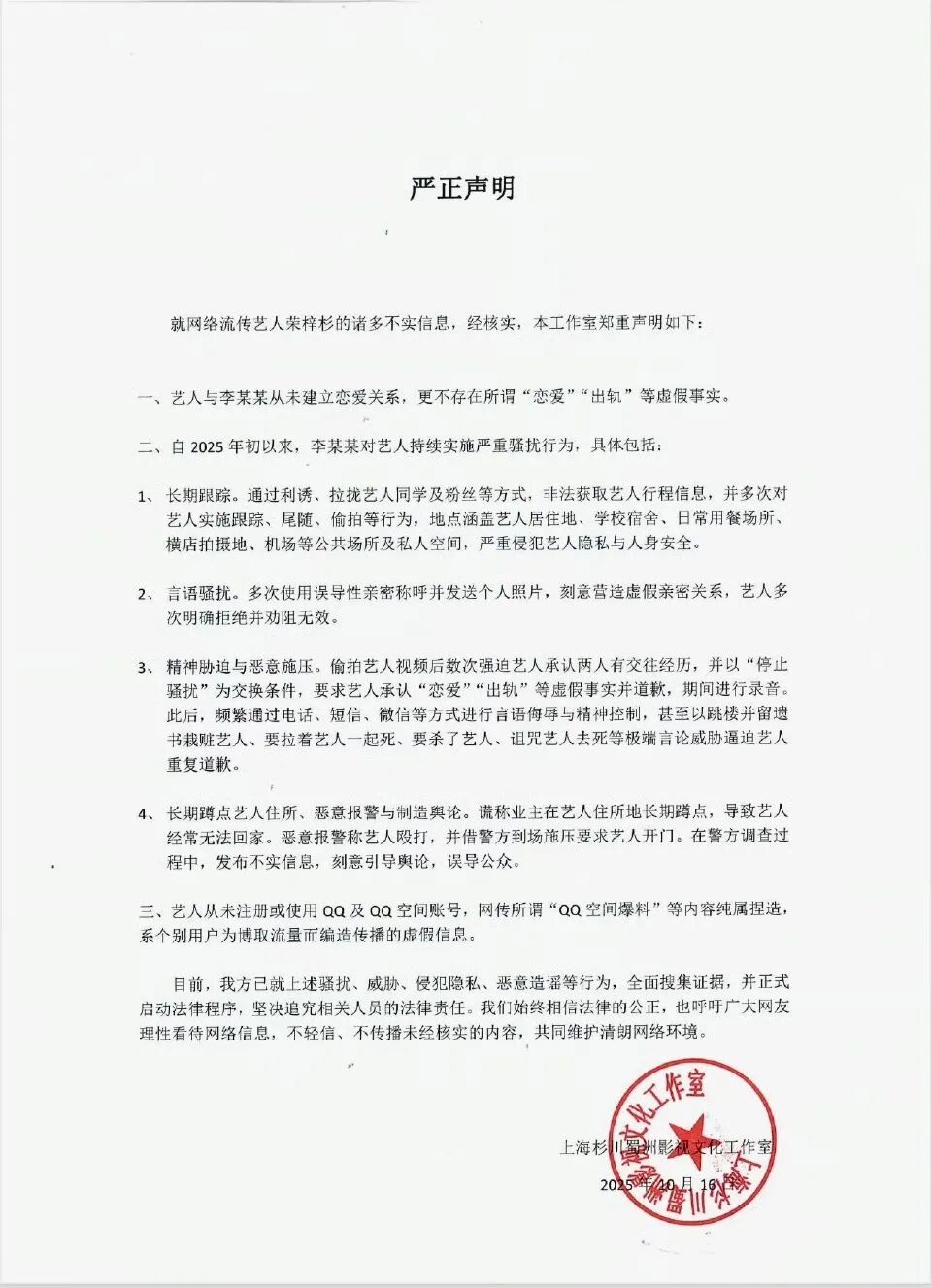 刚刚,荣梓杉工作室发出声明,提到荣梓杉与李某某从未建立恋爱关系,更不存在所谓“恋爱”“出轨” 等事实。同时更表示,年初以来,李某某对荣梓杉持续实施严重骚扰行为,包括长期跟踪,通过利诱、拉拢荣梓杉同学及粉丝等方式非法获取艺人行程信息。荣梓杉工作室还指控李某某言语骚扰,刻意营造虚假亲密关系,以及对荣梓杉进行精神胁迫与恶意施压等。